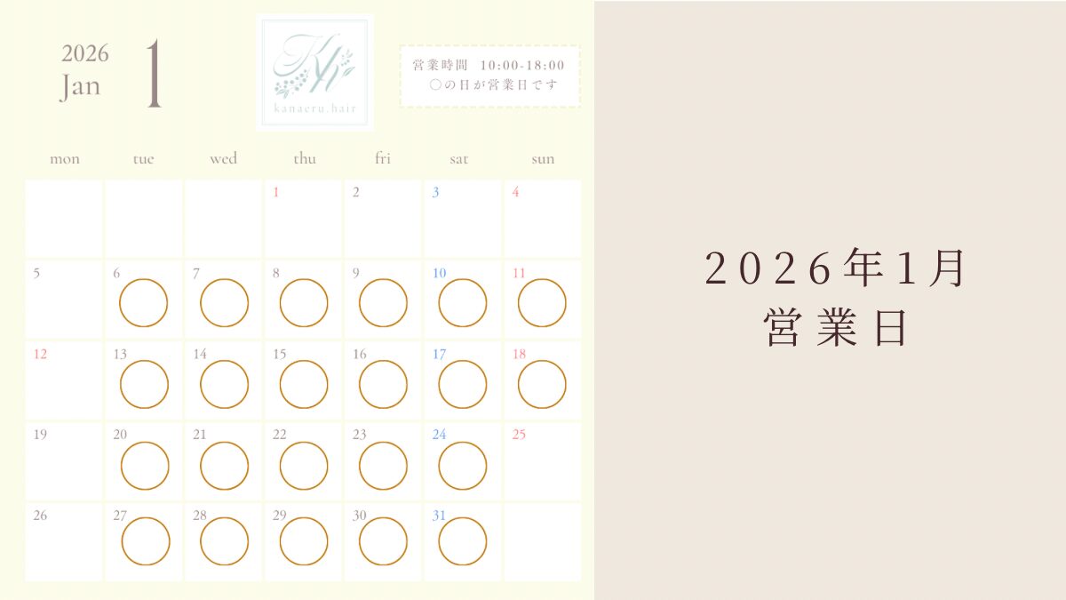 2026年1月は5日までお休みをいただき、6日火曜日から営業します。