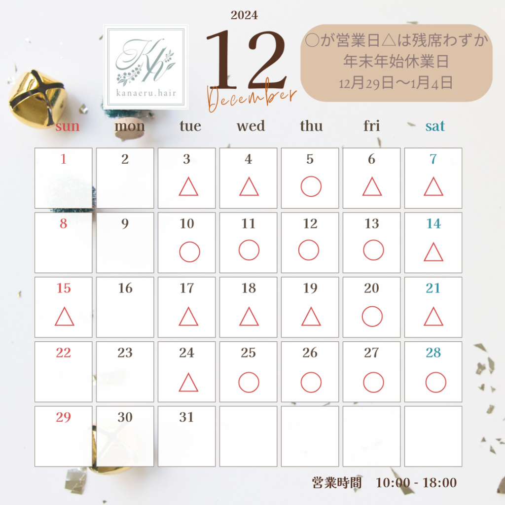 こんにちは。kanaeru.hairの中西です。 早いもので2024年も残すところ1ヶ月となりました。今年はいつになく駆け足で通り過ぎた感じがします。 さて、2024年12月は通常の営業日に加えて 12月15日(日)も営業します。 また、年末年始は12月29日から1月4日まで... -