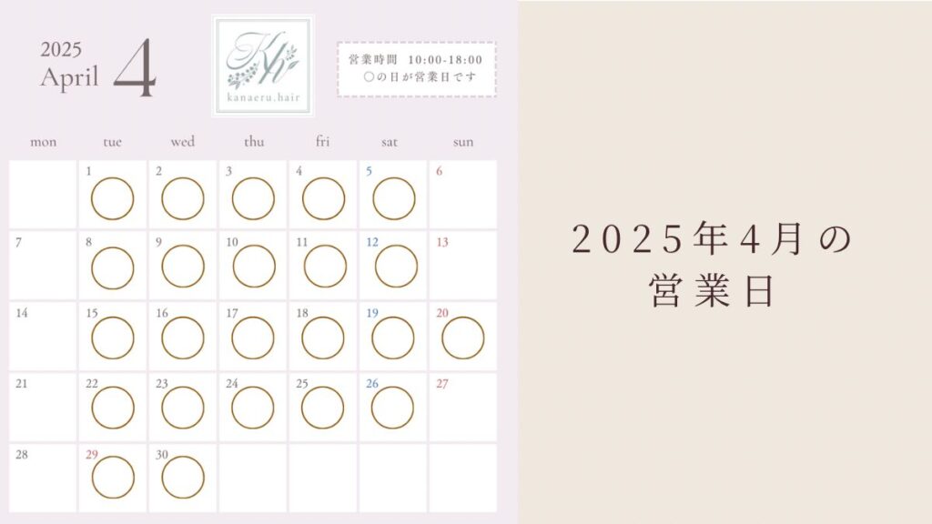 こんにちは。kanareu.hairの中西です。 新年度でバタバタしているうちに、 あっという間にゴールデンウィークがやってきました。 今年は、ゴールデンウィーク中も 日曜日月曜日休みの通常運転で営業します。 ※4月26日土曜日、29日火曜日(祝日)は 空... -