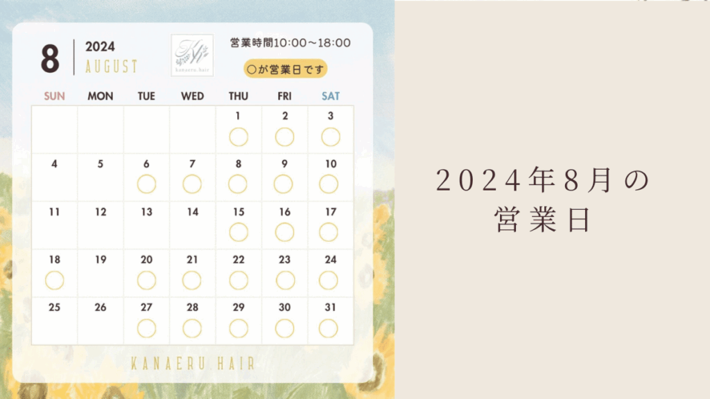 こんにちは!kanaeru.hair です。 いつも当店をご利用頂き誠にありがとうございます。 さて、2025年8月の営業日は、 通常の営業日に加えて17(日)も営業します。 *10日(日)から13日(水)までお休みします。 お陰様で、kanaeru.hairは8月26日に2周年を迎えま... -
