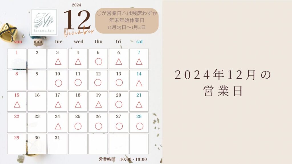 こんにちは。kanaeru.hairの中西です。 早いもので2024年も残すところ1ヶ月となりました。 今年はいつになく駆け足で通り過ぎた感じがします。 さて、2024年12月は通常の営業日に加えて 12月15日(日)も営業します。 また、年末年始は12月29日から1月4日ま... -