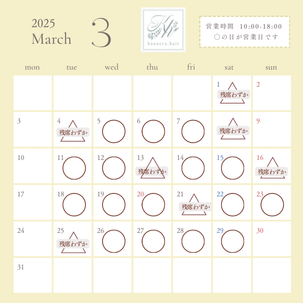 こんにちは。kanaeru.hairの中西です。 お店の近所の公園で梅の花が咲き始め、春を感じるようになりました。 3月は卒業式などのイベントや年度の移り変わりで、きっと人と会う機会もきっと増えますね! さて、2025年3月は、通常の営業日に加えて、1... -