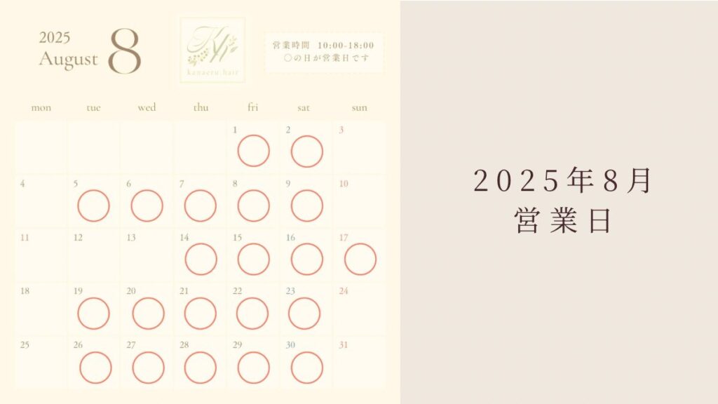 こんにちは!kanaeru.hair です。 いつも当店をご利用頂き誠にありがとうございます。 さて、2025年8月の営業日は、 通常の営業日に加えて17(日)も営業します。 *10日(日)から13日(水)までお休みします。 お陰様で、kanaeru.hairは8月26日に2周年を迎えま... -